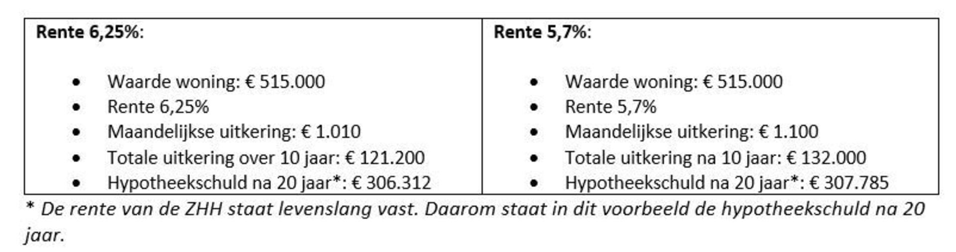 Verschil: de maandelijkse uitkering is met 5,7% € 90 per maand hoger, oftewel € 10.800 extra over 10 jaar. De totale hypotheekschuld schuld na 20 jaar is nagenoeg gelijk.